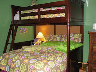 A year ago we purchased a loft bed and moved our older daughter from her full-size bed up to the top bunk of the loft, and moved our younger daughter from her toddler bed to the full-size bed under the loft. This meant I got to have some extra fun and buy new bedspreads! I shopped at Overstock and found a bedspread we all liked. We purchased the two different sizes and the required number of shams, but at Overstock, we didn't have choice of much else as far as coordinating things for their room, so we coordinated with color, mostly hot pink. Thankfully, we found bedspreads that matched the existing color of the walls (green), and we didn't have to paint. Then over the months we have added a lot of hot pink to the mix... hot pink sheets, hot pink curtain, hot pink rope lights that we use as a night light, hot pink lamp, small hot pink area rug, etc.